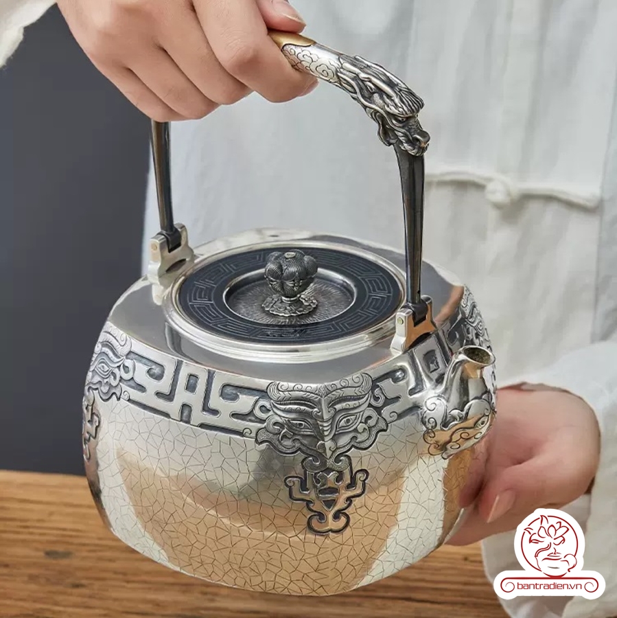 Ấm pha trà bạc nguyên chất chế tác thủ công.