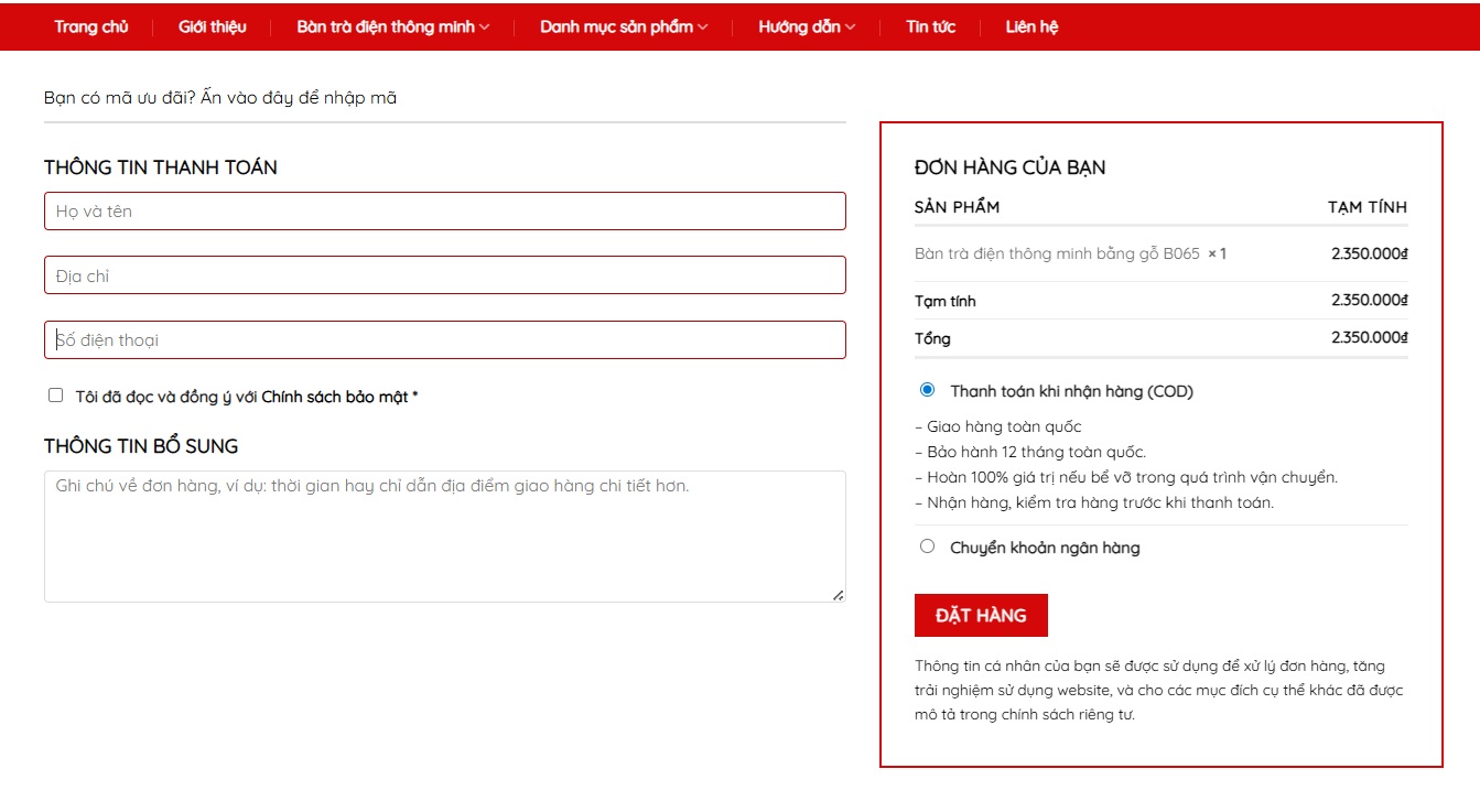 Bước 3: Sau đó quý khách tiến hành điền thông tin giao hàng tạo form yêu cầu, tích chọn đồng ý chính sách bảo mật thông tin, sau đó nhấn chọn Đặt hàng.