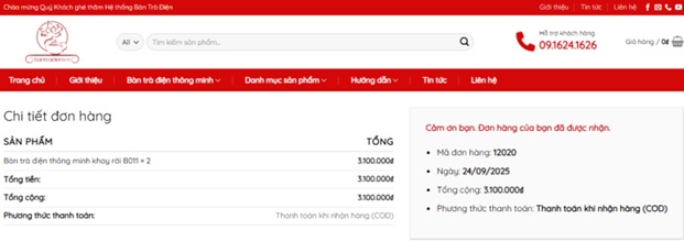 Bước 4: Sau đó hệ thống sẽ hiển thị xác nhận đơn đặt hàng, Quý khách vui lòng thanh toán tiền ngay khi nhận được sản phẩm hoặc chuyển khoản theo thông tin hiển thị trên màn hình, chúng tôi sẽ kiểm tra và tiến hành giao hàng ngay khi nhận được tiền.